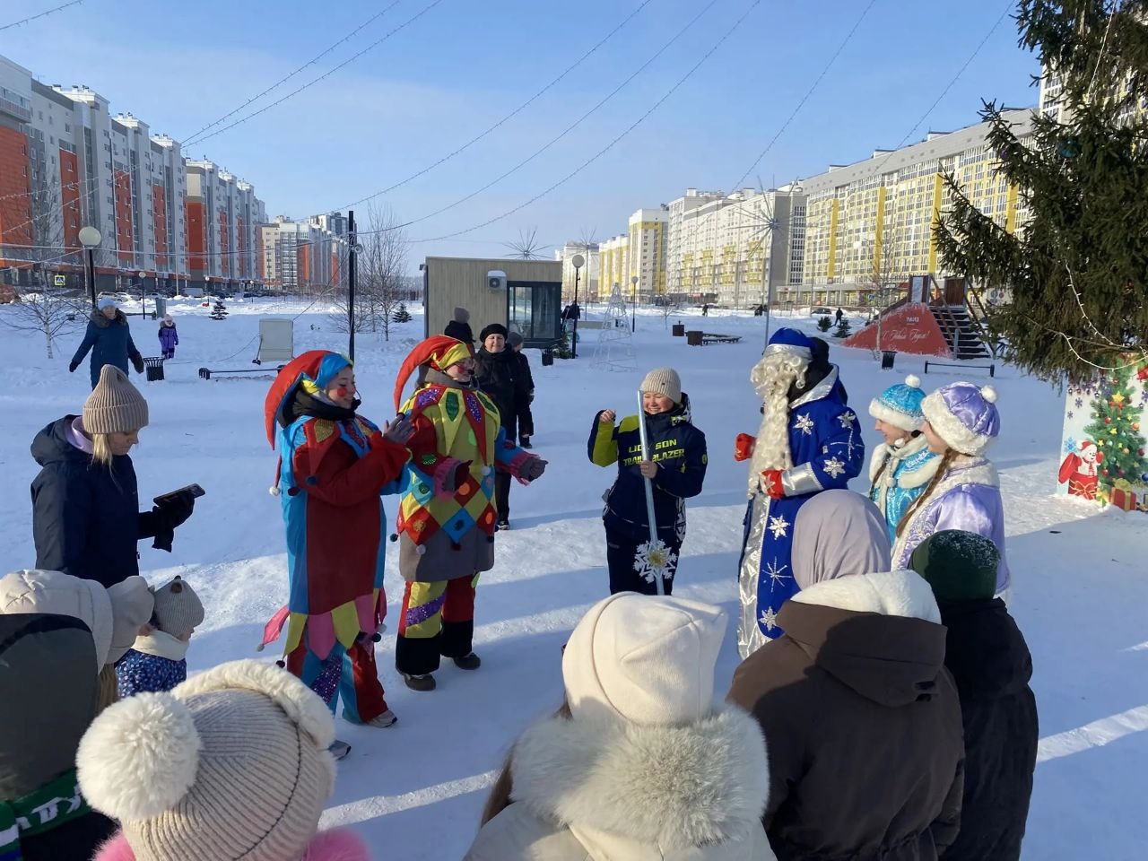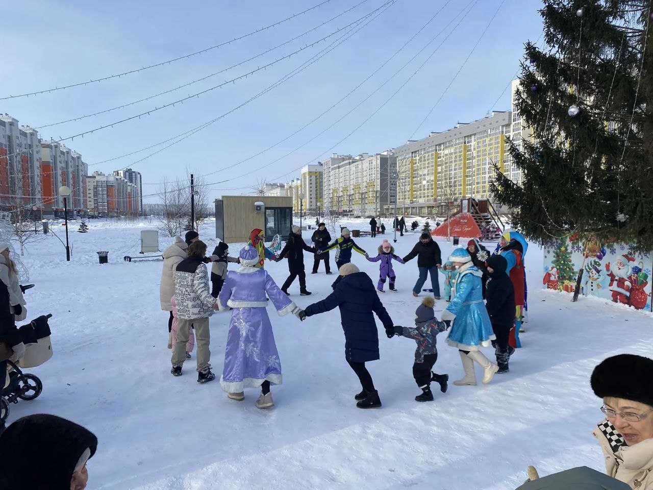 Жители микрорайона водили хороводы, пели песни с Дедом Морозом, Снегурочкой и их помощниками.