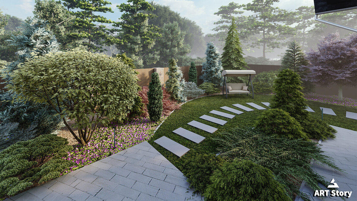 Дизайн сада базируется на смешении современного стиля с природными элементами, где первенствующий акцент сделан на современности. Малогабаритные архитектурные формы в стиле хай-тек гармонично сочетаются с природными посадками и зонами отдыха для детей. Дорожки и тропинки, выполненные из плитки, обеспечивают удобное передвижение по участку, а также направляют к зонам отдыха, где сосны, ели, сирень и можжевельники создают атмосферу спокойствия и уюта. Хозяйственный подход к организации пространства и внимание к деталям делают этот проект поистине уникальным.