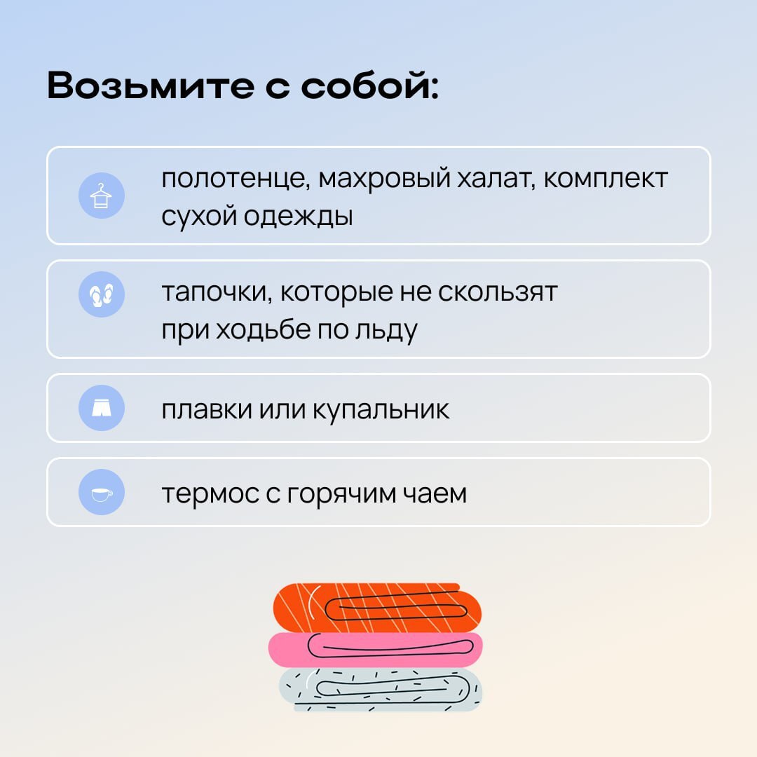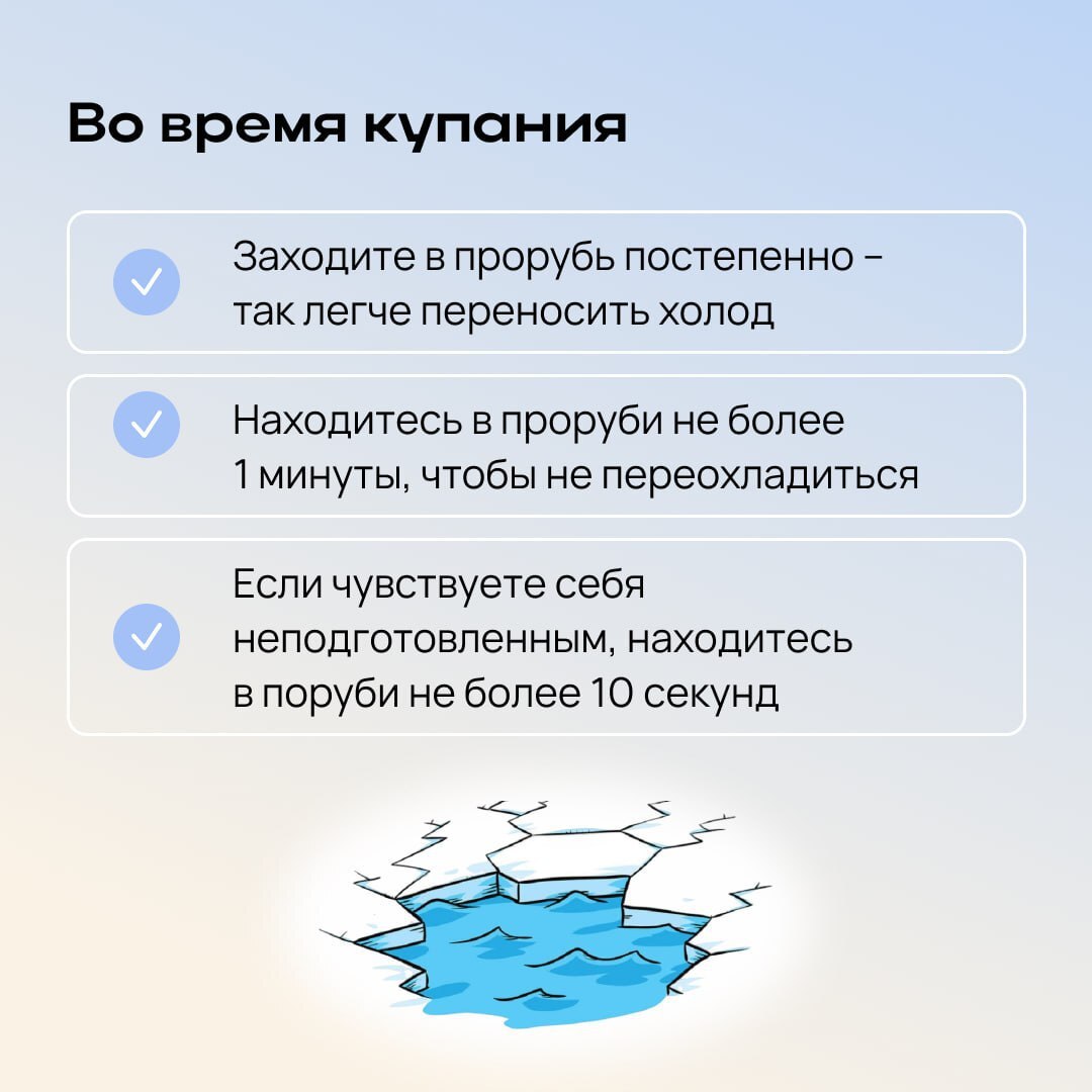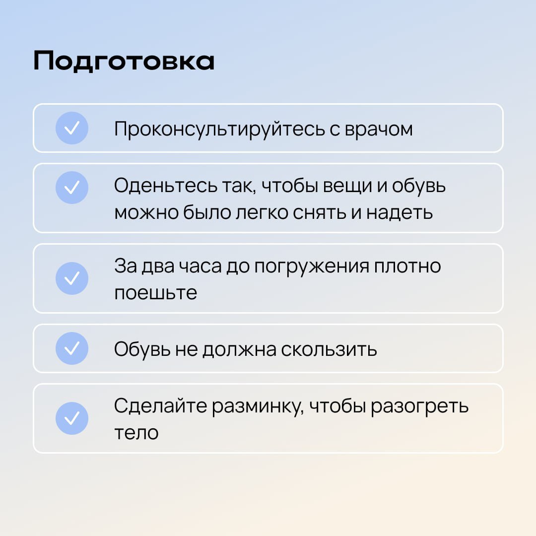 Перед погружением в воду рекомендуется:делать легкую разминку или пробежку, чтобы разогреть тело;надеть удобную, нескользящую и легкоснимаемую обувь, чтобы избежать потери чувствительности ног;при входе в прорубь стараться быстро достичь...