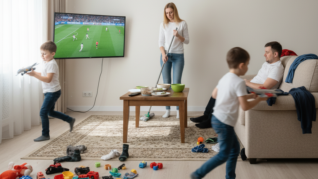С мужчинами или другими взрослыми членами семьи ситуация может быть сложнее. Часто встречается мнение, что уборка — это "женское дело". Однако реальность такова, что мужчины также являются главными источниками беспорядка. При попытках изменить ситуацию разумно использовать юмор и легкость в общении, чтобы достичь общих целей.
