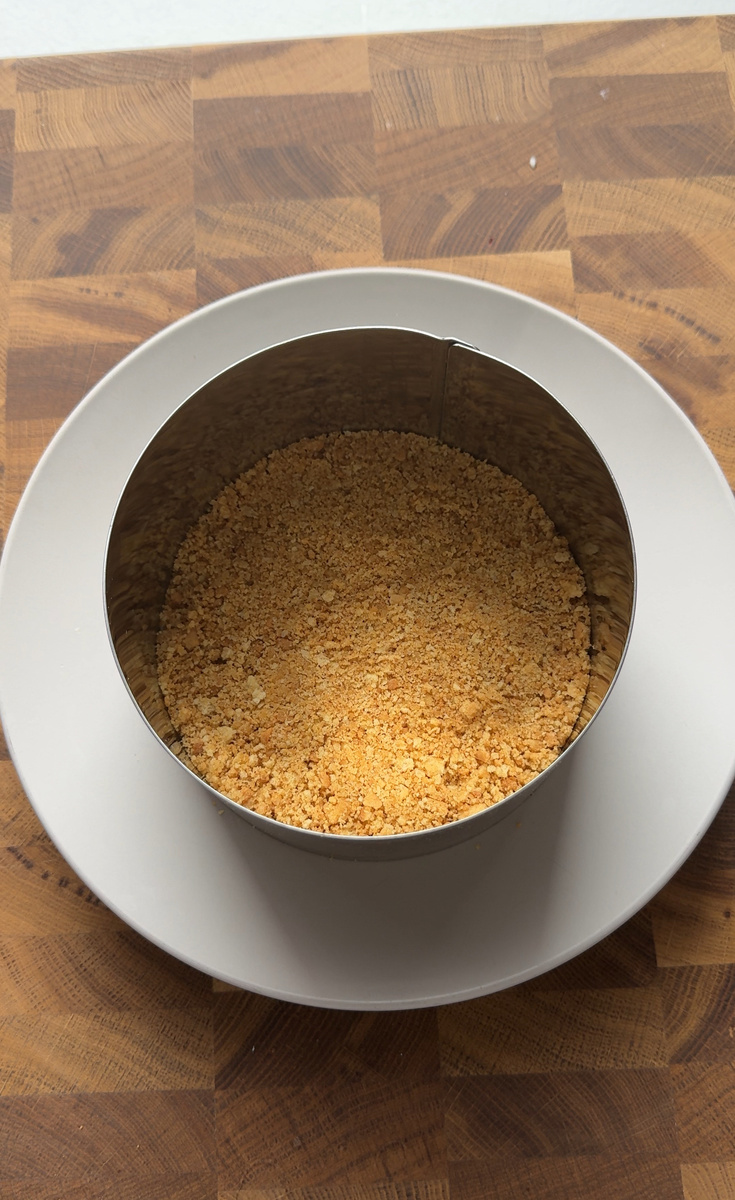 1. Начать с основы: печенье измельчить до состояния крошки и соединить с растопленным сливочным маслом. Получившуюся массу равномерно распределить по дну формы и хорошо утрамбовать.