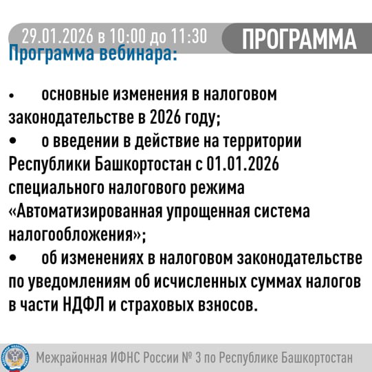 Межрайонная инспекция Федеральной налоговой службы №3 по Республике Башкортостан приглашает налогоплательщиков принять участие в вебинаре по теме: «Актуальные вопросы налогового законодательства».