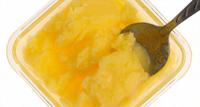 Топленое масло начинается как привычное сливочное. Но длительная тепловая обработка удаляет жидкость — влагу, белки и сахарозу — так что остаётся почти чистый молочный жир. Именно поэтому его процент жира приближается к 99%, а текстура становится зернистой из-за кристаллизации жира во время нагрева. Такой состав и определяет его характерные свойства на сковороде.