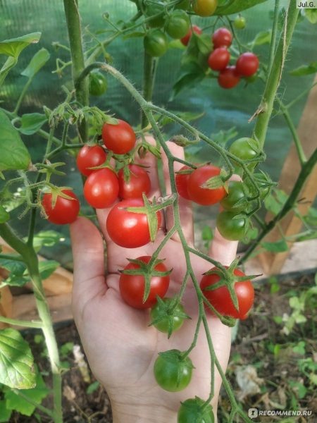 Особенность сорта — кистевидное плодоношение: на длинных кистях расправляются десятки маленьких плодиков весом около 10 граммов. Плоды отличаются плотной кожицей и сбалансированным вкусом, что делает их удобными для консервации, засолки и украшения блюд.