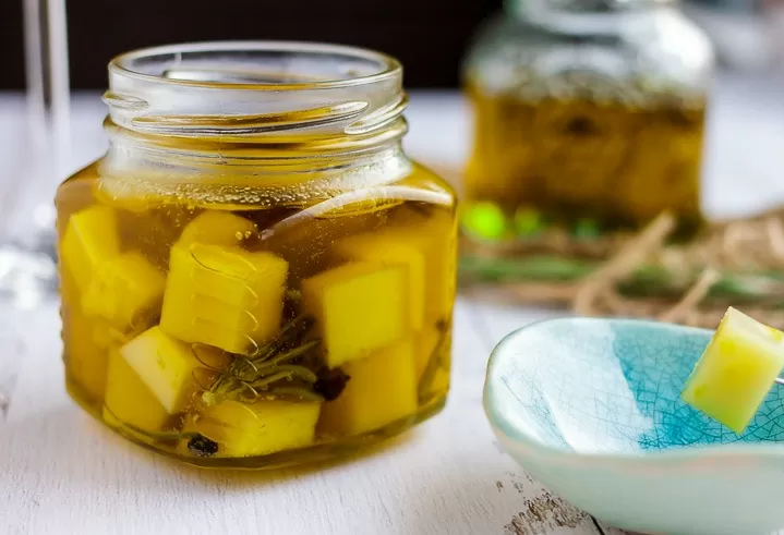 Залейте сыр оливковым маслом холодного отжима, так чтобы он полностью покрывался. Банку закрыть крышкой и хранить в темном и прохладном месте. В холодильнике масло застывает, поэтому предпочтительно держать в прохладе, но не замерзать. Вкус сыра развивается со временем: первые ноты появляются через день, а для насыщенного акцента потребуется несколько суток.