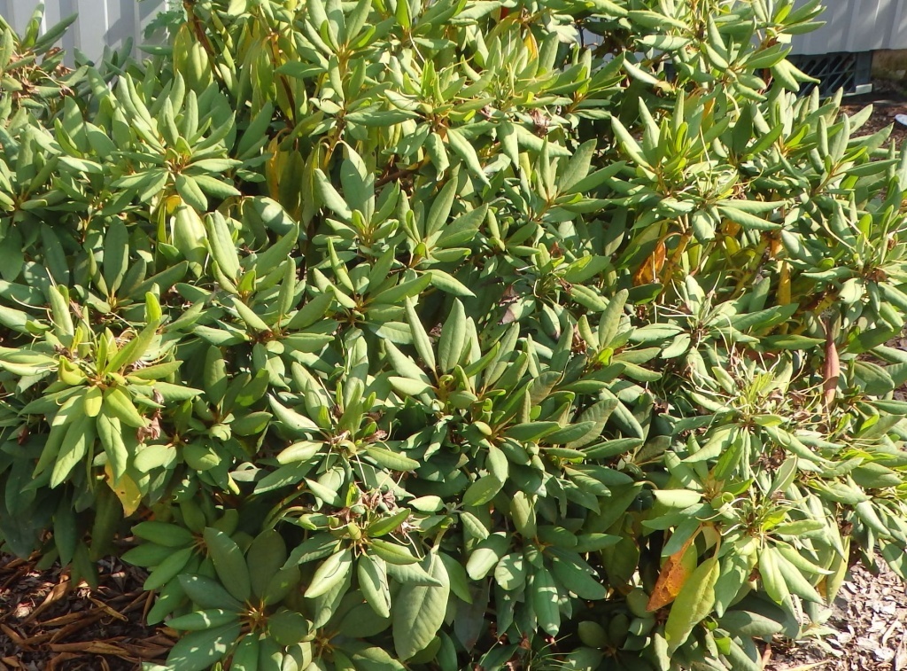 Видимая смена цвета зелени на кустарнике часто становится простым следствием того, как за растением ухаживают в обычной садовой суете. Вероятно, здесь речь идет о привычной смене условий вокруг рододендрона и его реакции на них.