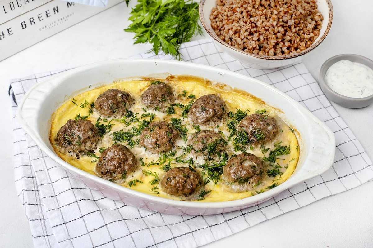Шаг 4: Приготовьте соус, смешав йогурт, оставшийся укроп и чесночный порошок. Подавайте фрикадельки горячими, выложив их на гречку и полив соусом. Также можно обжарить фрикадельки на сковороде, после чего добавить яичную смесь и готовить под крышкой на медленном огне.
