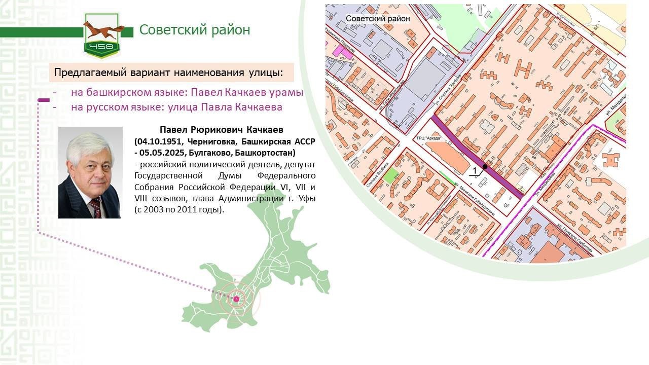 Имя бывшего мэра Уфы и депутата Госдумы Павла Качкаева предложено дать улице, пролегающей между улицами Злобина и Менделеева за ТЦ «Аркада».