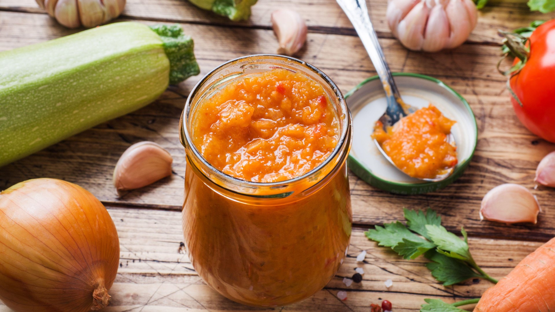 Обжаренные овощи измельчите блендером. Добавьте специи и уксус, а затем отправьте массу вариться в течение получаса. Разложите икру по банкам и сразу закатайте их. Затем банки следует перевернуть и подержать под одеялом, пока не остынут, делится рецептом «Гастрономъ».