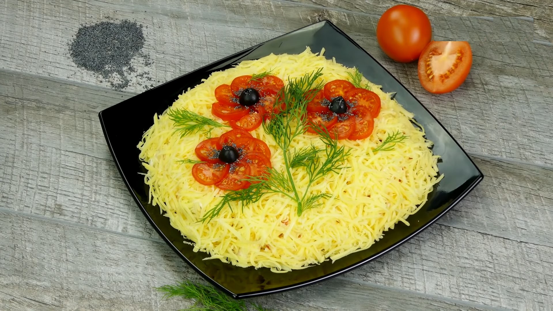 - оливки, томаты черри, укроп и мак для украшения.