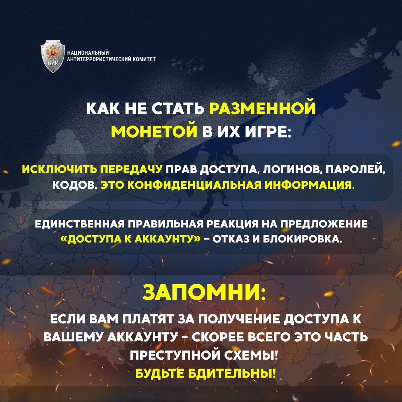Национальный антитеррористический комитет предупреждает о мошенничестве в "Телеграм". Будьте бдительны и не передавайте никому доступ к своему аккаунту.