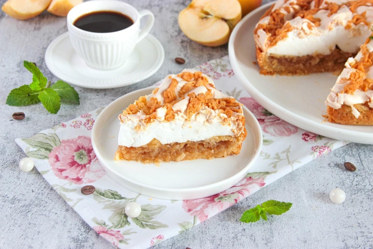 5. Сборка пирога: Выложите тесто в подготовленную форму, добавьте яблочную начинку, затем безе. Посыпьте оставшимся тестом и отправьте в духовку на 30-40 минут.