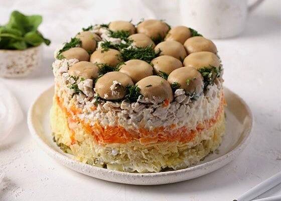 Грибная поляна по праву считается одним из самых популярных блюд на торжествах. Её яркая подача и насыщенный вкус делают её фаворитом на любом застолье. Салат нежный, сытный и невероятно гармоничный — неудивительно, что он исчезает с праздничного стола быстрее всего.