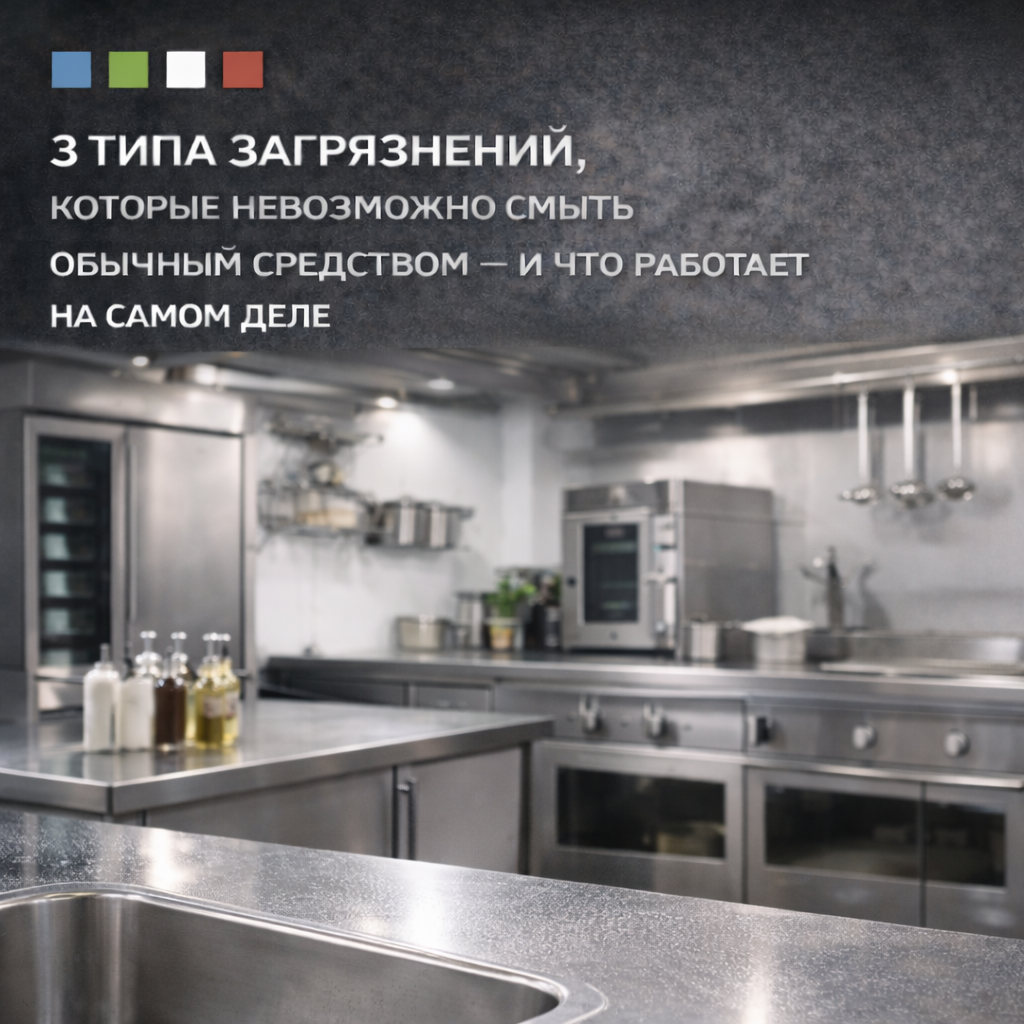 Эксперты в этой сфере выделяют три основных типа загрязнений, для которых требуется специализированный подход. Именно для этих случаев была разработана линейка M1 Professional Chemistry.