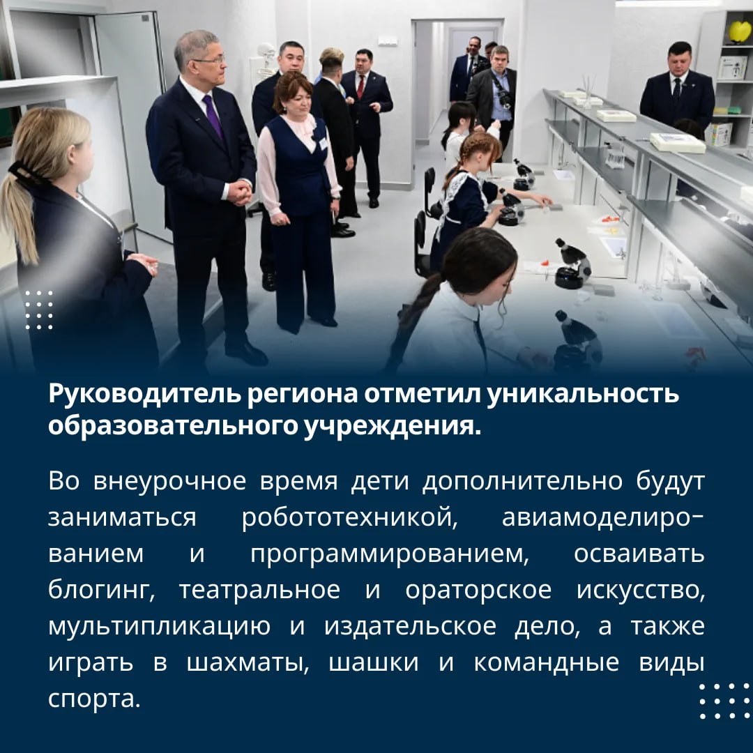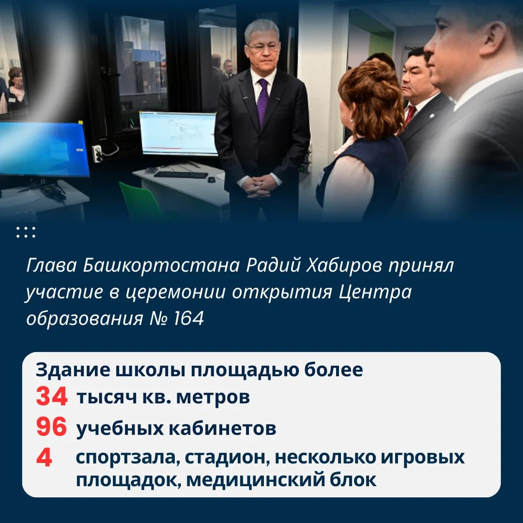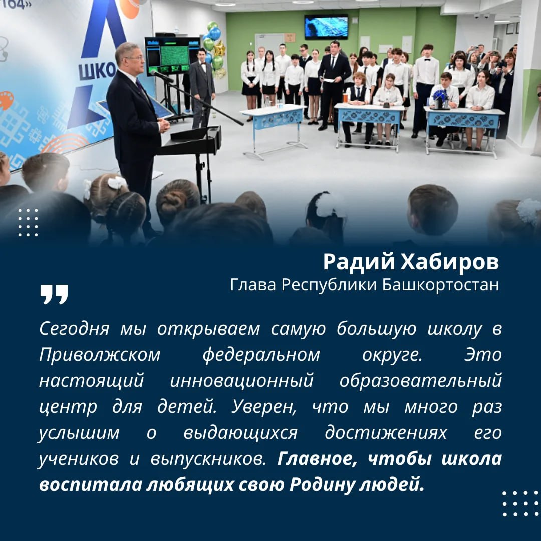 Церемонию открытия посетил глава Башкирии Радий Хабиров. Руководитель республики осмотрел просторные кабинеты и лаборатории, пообщался с педагогами и строителями и лично поздравил учеников с началом новой главы в их школьной жизни.