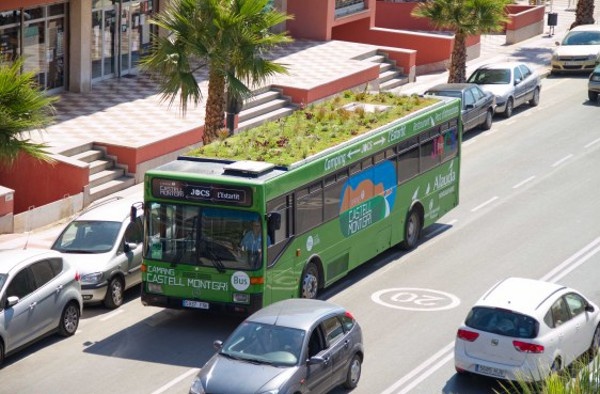 Эта совершенно нетривиальная идея пришла в голову ландшафтному дизайнеру и воплотилась в испанском городе Жирона. Над автобусом возвышается легкий слой минеральной ваты, в который высажены растения, а полив осуществляется как из шланга, так и из системы кондиционирования. Вы бы задумались об этом?