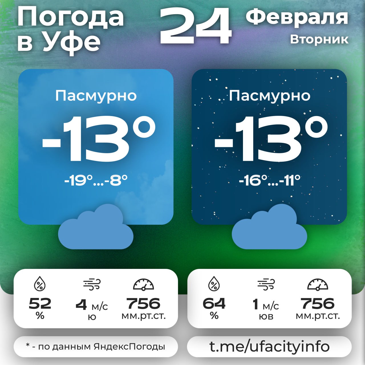 Без существенных осадков.Ветер южный 5-10 м/с.Температура воздуха ночью -13,-18°, местами -22,-27°, днем -7,-12°, местами до -1°.На автодорогах утром местами дымка, видимость 1-2 км.В Уфе переменная облачность. Без существенных...