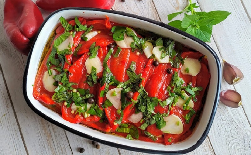 Когда перцы готовы, их выкладывают на тарелку и оставляют немного остыть. Если кожица легко отделяется, ее можно снять для большей нежности. Перцы разрезают вдоль или пополам и выкладывают слоями на плоскую тарелку, обильно используя заправку из зелени и чеснока. Закуску можно подавать сразу, но лучше убрать в холодильник на несколько часов — вкус станет глубже и насыщеннее.