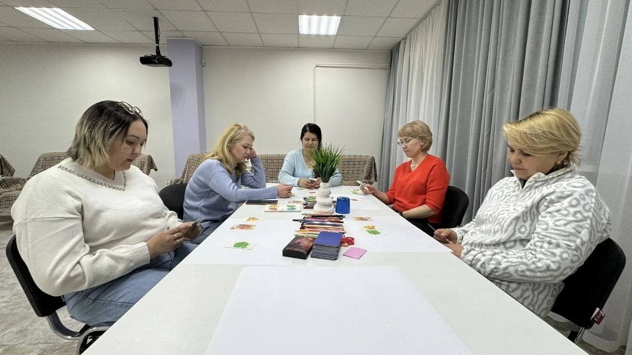 В рамках занятия участницы выполняли арт-терапевтическую практику «Сосуд моей души» — через рисунок исследовали своё внутреннее состояние, осознавали, чем наполнен их «сосуд», и какие ресурсы помогают сохранять устойчивость. Дополнительно использовались метафорические ассоциативные карты (МАК), которые помогли глубже прикоснуться к чувствам, найти слова для переживаний и увидеть новые точки опоры.