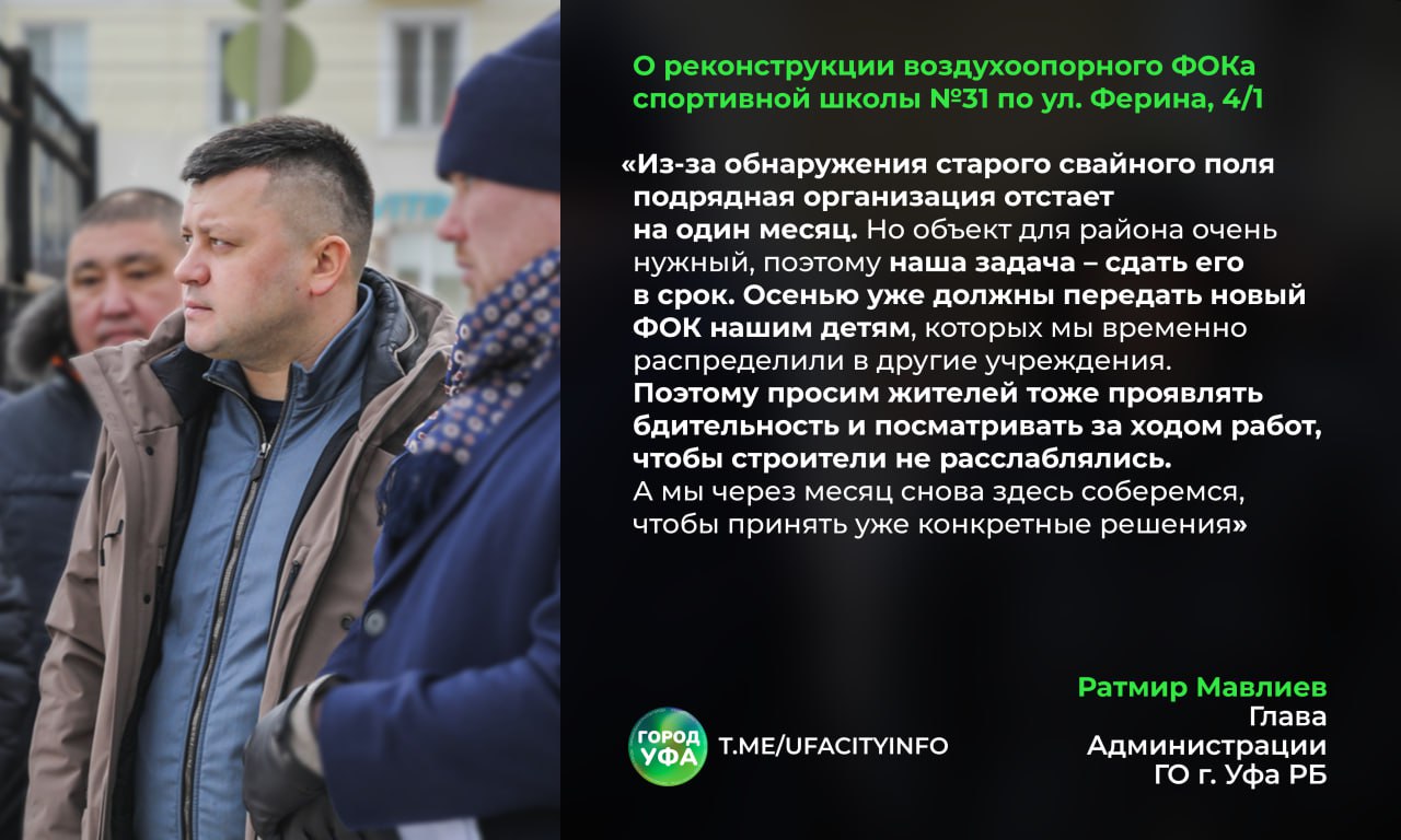 26 февраля мэр Уфы Ратмир Мавлиев провел выездное совещание на месте реконструкции воздухоопорного ФОКа спортивной школы №31 по ул. Ферина, 4/1