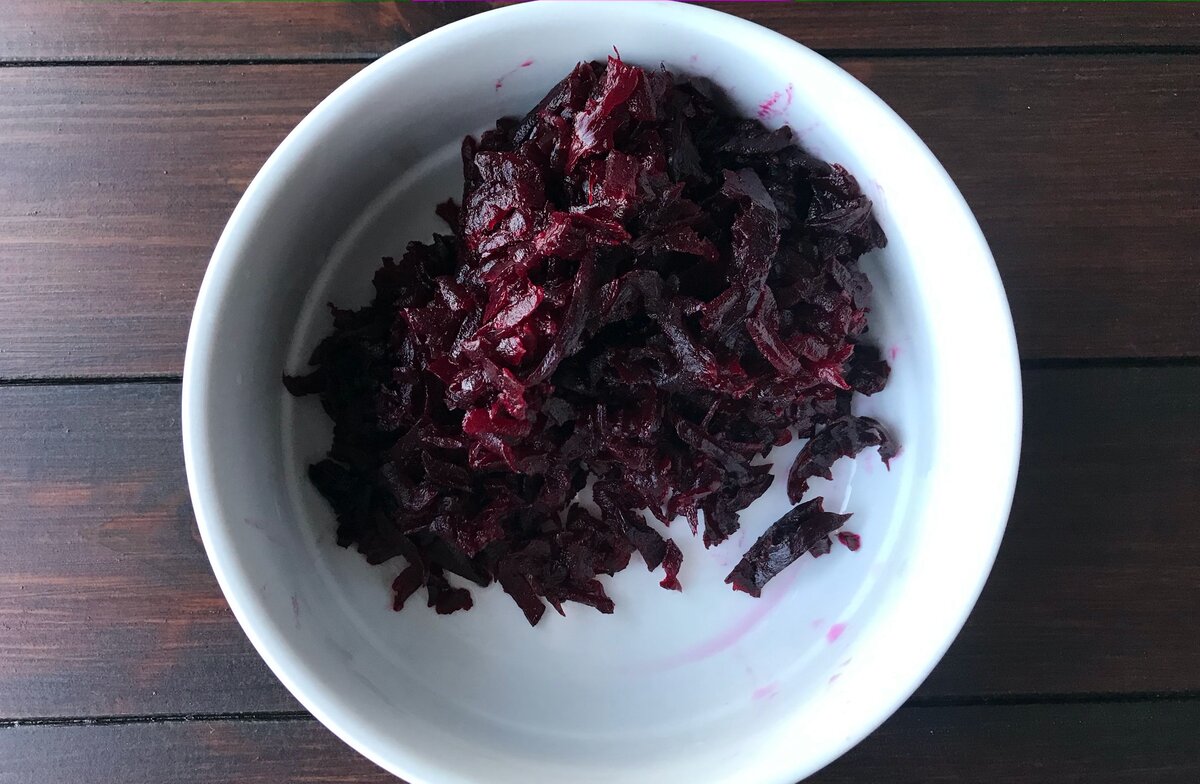- Накануне необходимо очистить вареную свеклу и натереть ее на крупной терке. Выложить в красивый салатник.