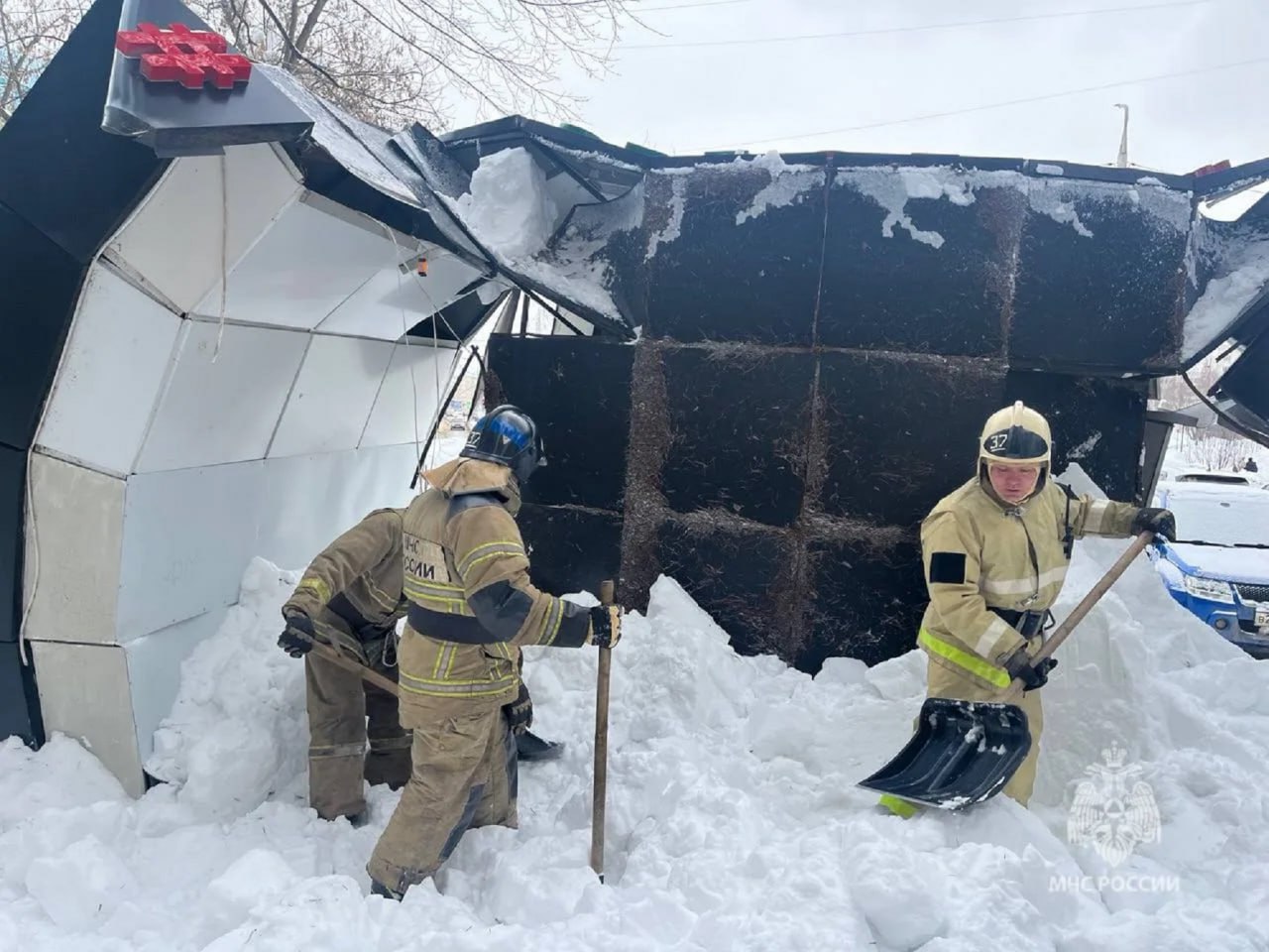 Спасатели оперативно расчистили снежный завал и проверили территорию — пострадавших нет. Металлическую конструкцию полностью демонтировали.