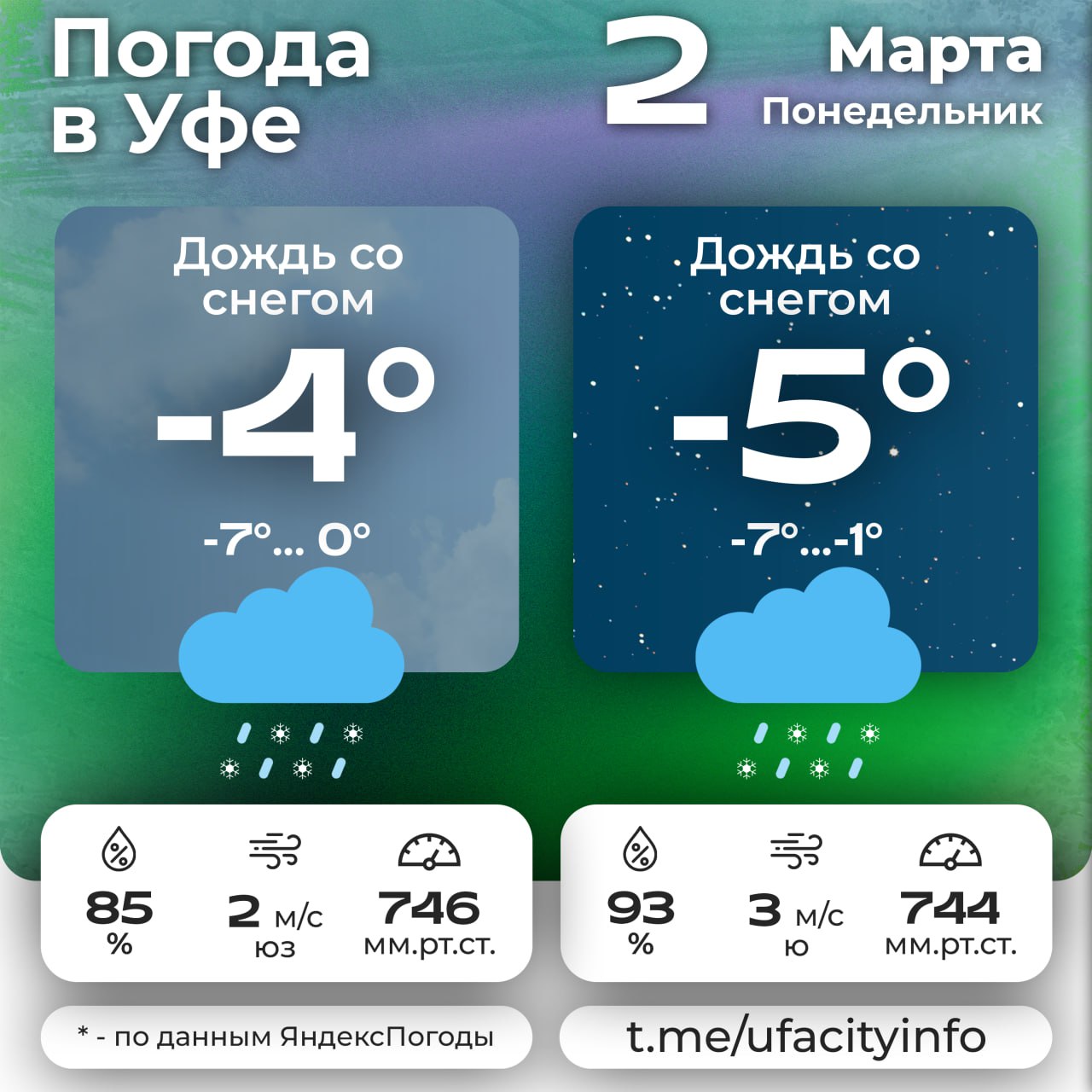 Скользко и сыро2 марта в Уфе ожидается облачная погода с небольшим снегом, переходящим в мокрый. Местами возможен гололёд, на дорогах — гололедица.Ветер сменит направление с южного на северо-западный, до 12 м/с.Температура ночью -4…-6°, днём около...
