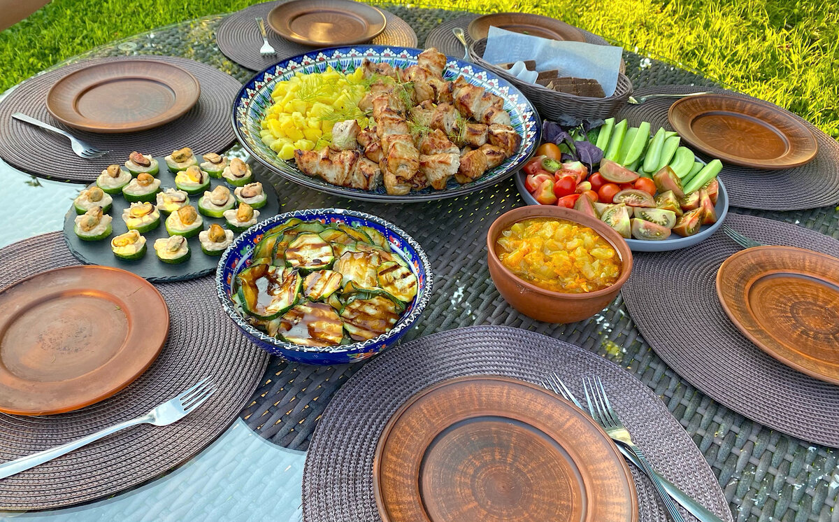 На этот раз в меню был шашлык из индейки, который готовится по особому рецепту маринада. Поджаренная на сливочном масле молодая картошка стала идеальным гарниром к мясу. Также на столе не обошлось и без различных овощей: кабачки, обжаренные на гриле, и тушеные овощи с томатами, морковью и луком, которые приготовила мама.