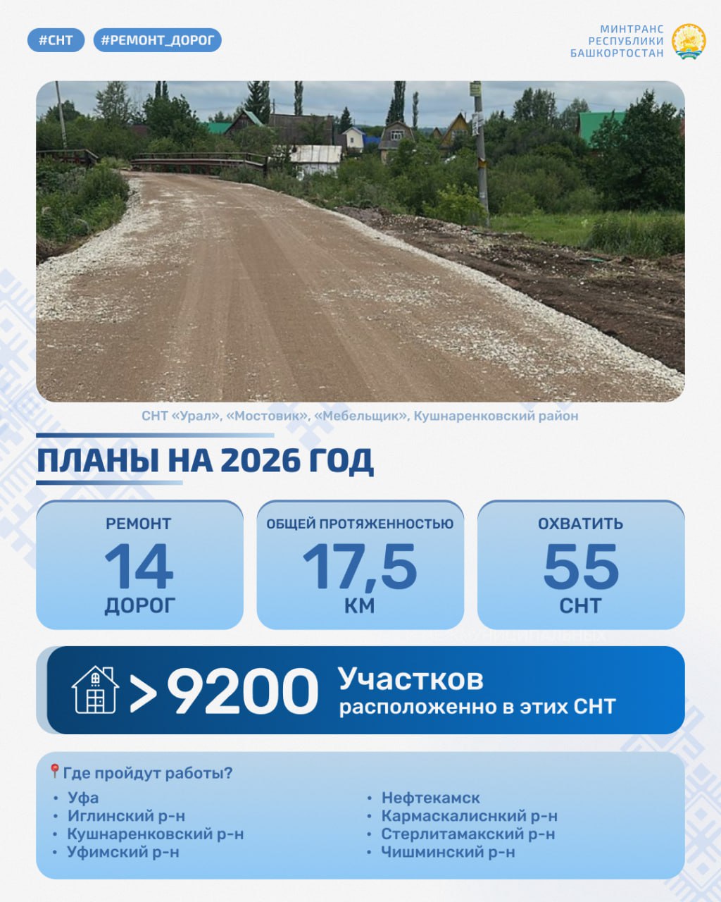 С 2022 года по поручению Главы Республики Башкортостан Радия Хабирова из Дорожного фонда ежегодно выделяются средства на ремонт подъездных дорог к садовым товариществам. За четыре года отремонтировано 109 км подъездных дорог к 297 СНТ.