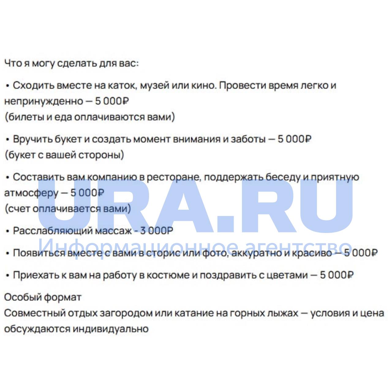 Так, предприимчивый челябинец за оговоренную сумму готов засветиться с заказчицей в сторис или даже приехать в офис и подарить цветы (их оплатит, конечно, не он). На Ямале мужчина рассматривает встречи от 1.5 тыс. рублей. В Уфе исполнитель может прийти на свидание в определенном стиле. В Москве парень очень высокого мнения о себе цена доходит до 120 тыс. А в Екатеринбурге молодой человек в объявлении указал, что готов провести время бесплатно.