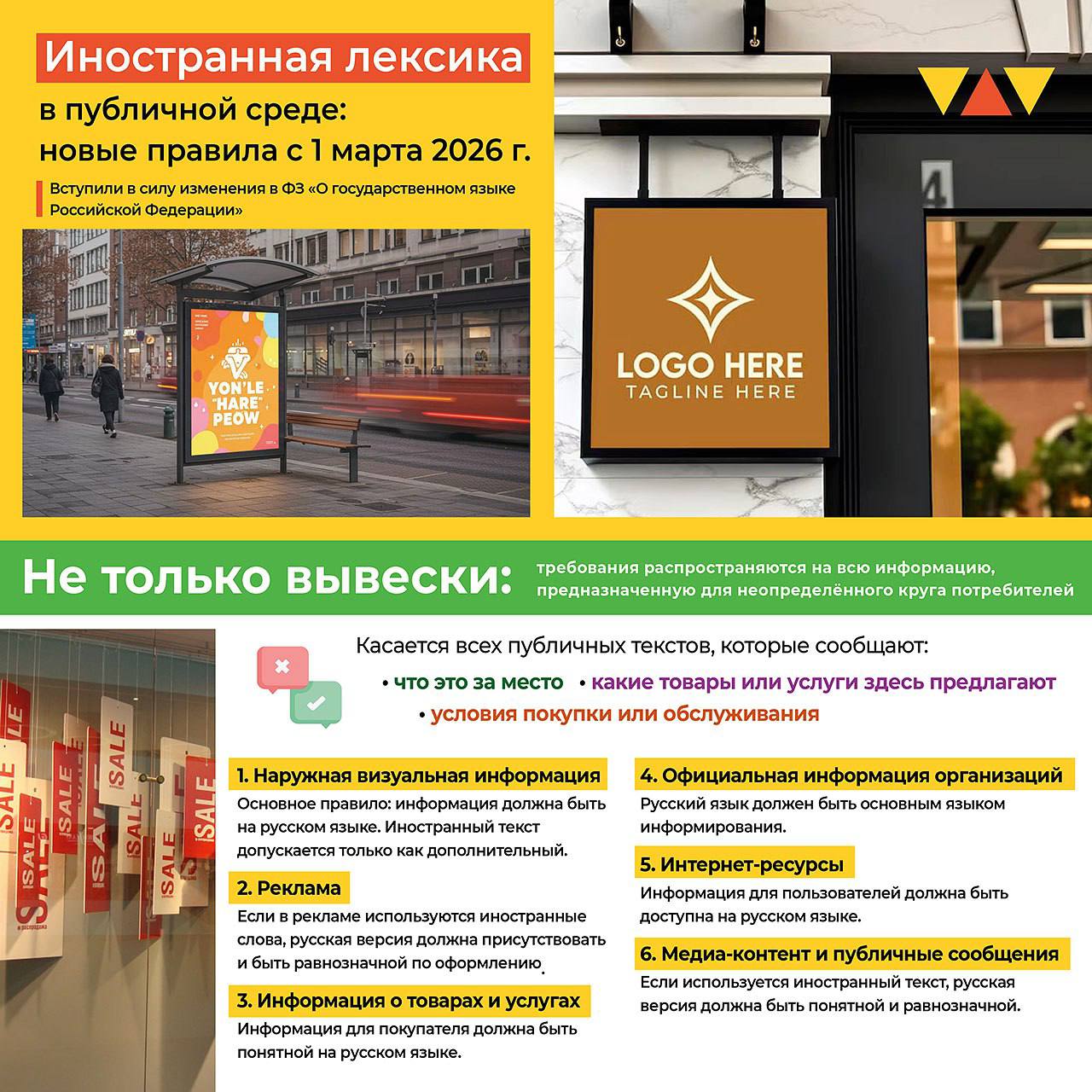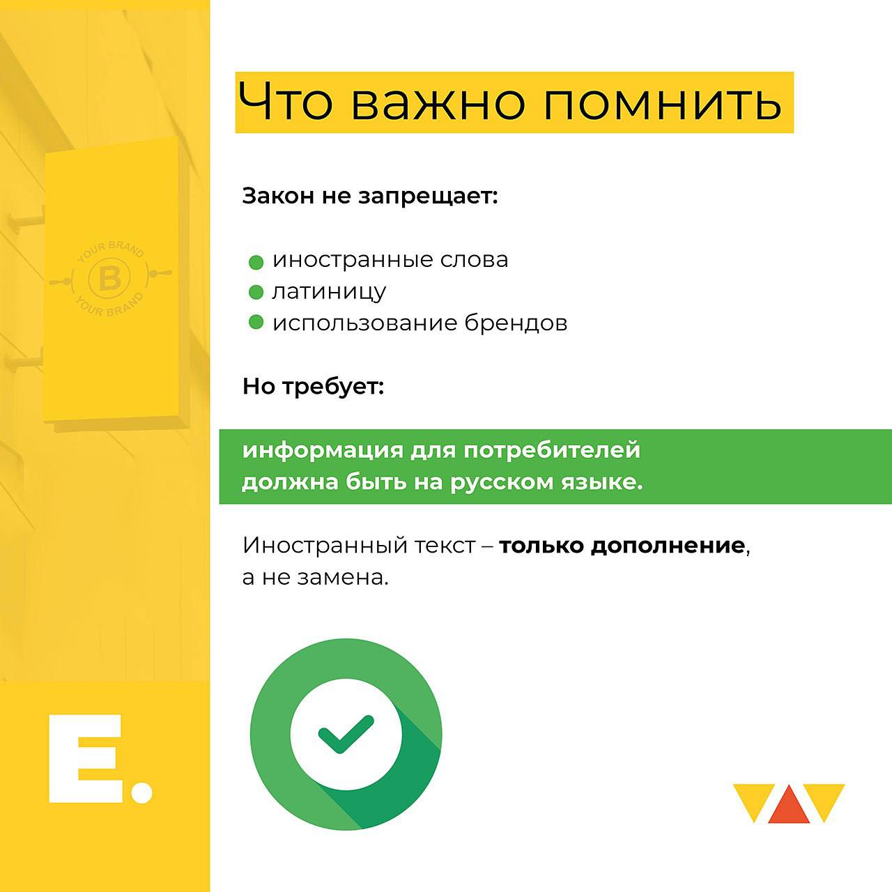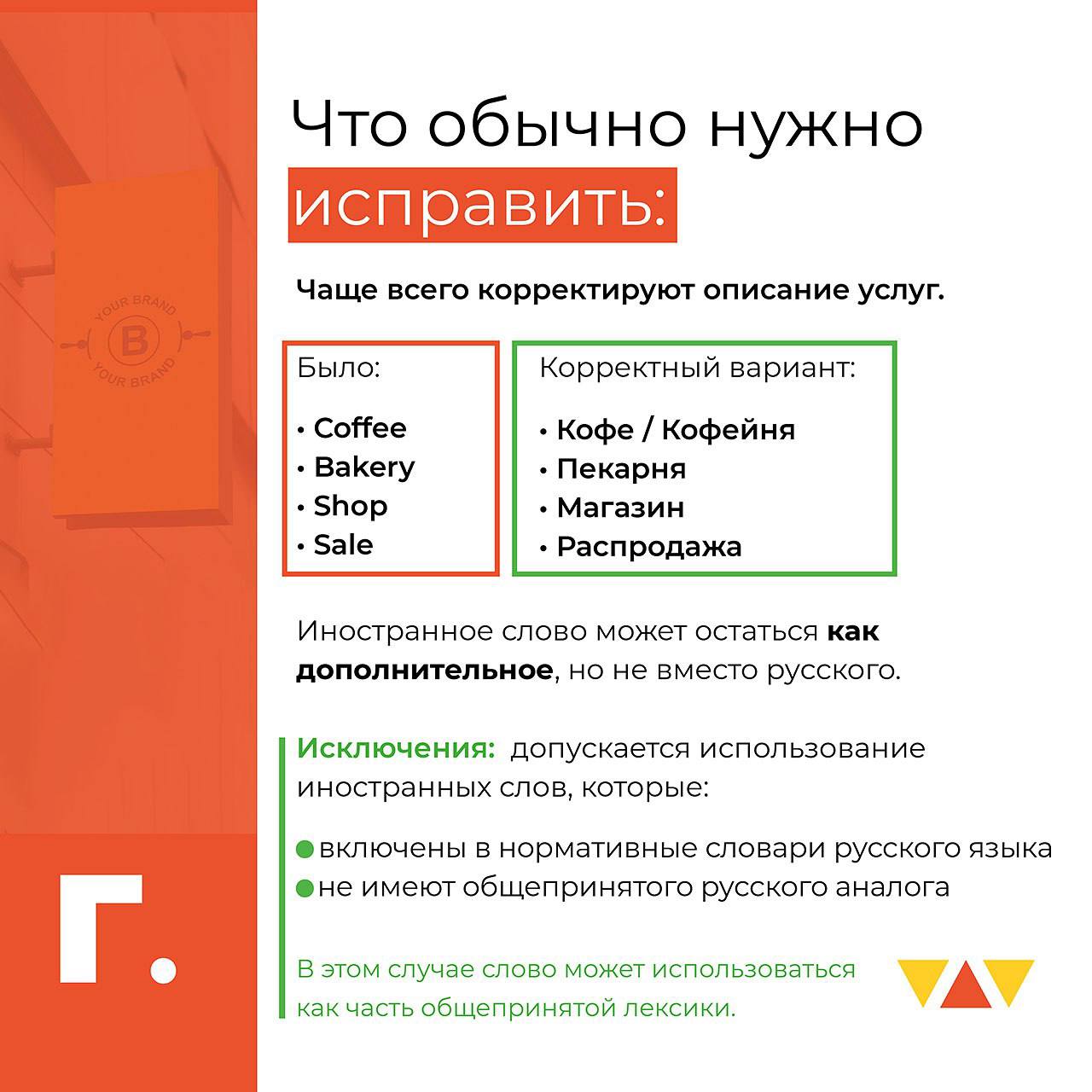 • Если есть иностранный текст — русская версия обязательна