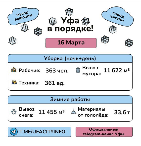 Круглосуточно производится очистка улиц и тротуаров, а также обработка их противогололедными материалами. Весь снег вывозится на специализированный снегоплавильный пунктВ связи с потеплением, особое внимание уделяется очистке крыш и карнизов...