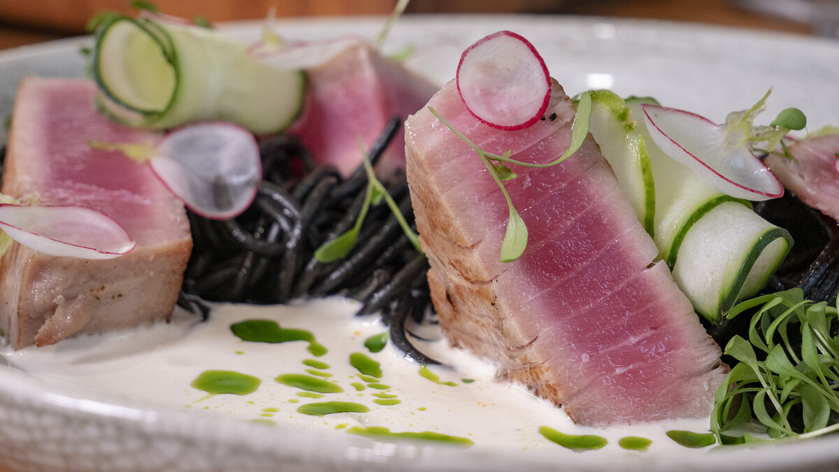 В сковороду наливаем оливковое масло, добавляем отваренные спагетти и натертую цедру лимона, прогревая все вместе. Завершаем блюдо, посыпая спагетти копченой паприкой и выкладывая их на тарелку с кусочками тунца, сливочным соусом и украшениями из огурца, редиса и микрозелени.