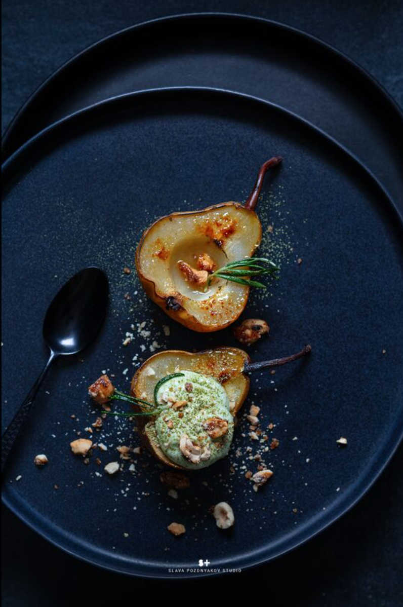 Для оформления запечённой груши с орехами и розмарином был выбран темный фон и посуда. Эта стилистика подчеркивает красоту десерта и делает его основным акцентом в любом фотоснимке.