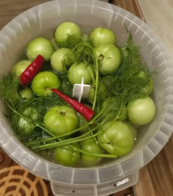 Следующий шаг — уложить помидоры в подготовленный контейнер для квашения. Можно использовать чистое пластиковое ведро или глубокую кастрюлю. Сверху удобно положить укроп и стручок перца.