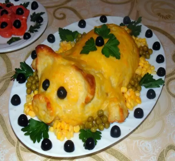 Теперь самое время собрать блюда в единую композицию. На застеленный пергаментом противень выкладывают половину картофельного пюре в виде овала, сверху равномерно распределяют мясную начинку и закрывают оставшимся пюре, формируя «тело» поросенка. Уши, ножки и хвостик можно сделать из оставшейся картошки, а для глаз использовать половинки маслин. Блюдо смазывают оставшимся яичным желтком и отправляют в разогретую духовку.