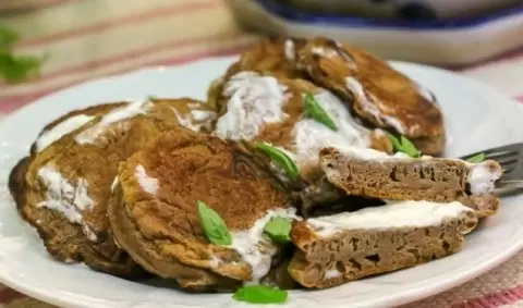 7. Готовые оладьи смазывайте сметаной, укладывайте слоями в сковороду и подогревайте на маленьком огне 3-5 минут, чтобы они стали еще более вкусными.