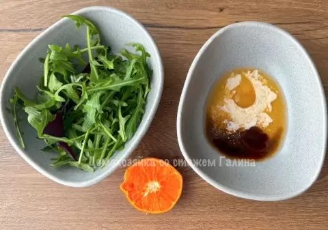 1. Для заправки следует выжать сок спелого мандарина, смешать его с соевым соусом, медом и кунжутным соусом. Тщательно перемешать все ингредиенты, чтобы получить ароматную заправку.