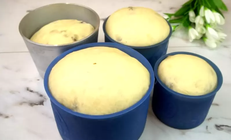 После этого тесто нужно обмять, добавить изюм (предварительно промытый и высушенный), и снова оставить на полчаса для подъема. Затем тесто раскладывается по формам, заполняя их на одну треть. Куличи накрывают полотенцем и оставляют подходить еще раз. Выпекать следует при температуре сначала 100 градусов в течение 15 минут, а затем поднимают температуру до 180 градусов для хорошей корочки, проверяя готовность с помощью деревянной шпажки.