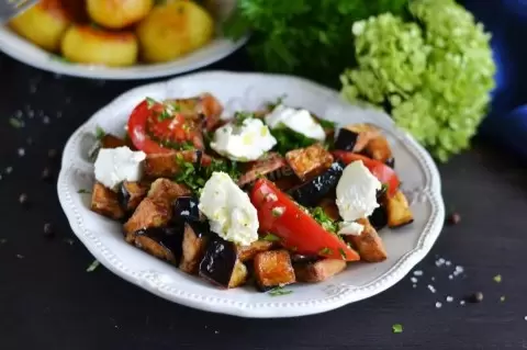 Когда баклажаны готовы, их комбинируют с помидорами, чесноком и рубленой петрушкой, затем аккуратно перемешивают. В конце, на верх салата выкладывают творожный сыр и поливают заправкой, чтобы насладиться вкусом в теплой версии блюда.