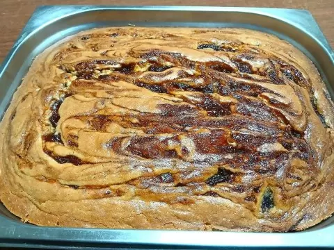 Пирог хорош как тёплым, так и полностью остывшим. При желании можно дополнить пудрой или сливками, а хранить — в закрытом виде до нескольких дней.