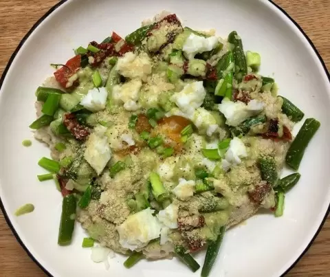 Каша готовится очень просто. Сначала геркулес варится до полной готовности. Яйца можно приготовить на свой вкус — в глазунью, в микроволновке или отварить. Фасоль следует немного поджарить и потушить. Все ингредиенты складываются на одно блюдо, и ваше полезное блюдо готово к подаче!