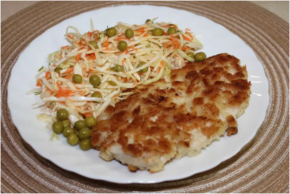 Для завершения блюда подойдет легкий капустный салат, который отлично дополнит шницель. Основные ингредиенты салата: