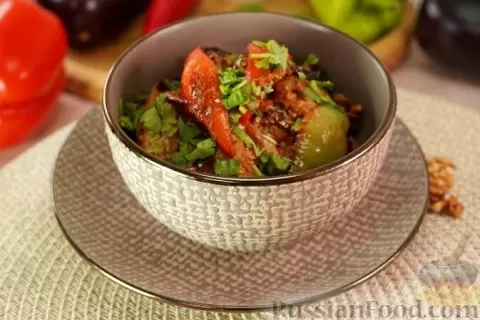 - Закуска из жареных баклажанов и перца с грецкими орехами — пикантное сочетание с соевым соусом, которое станет отличным легким вариантом для любого вечера.