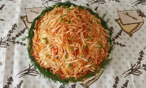 Салат получается не только сытным, но и очень вкусным – его оценят не только взрослые, но и дети благодаря хрустящим картошечным чипсам. Поэтому он заслуженно занимает почетное место на праздничном столе, радуя всех своим насыщенным вкусом и оригинальным оформлением.