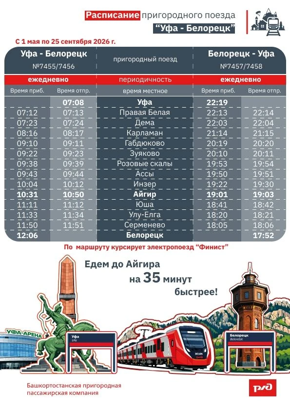 - №7455/7456 Уфа (отпр. 07.08) – Айгир (приб. 10.31, отпр. 10.50) – Белорецк (приб. 12.06) – ежедневно;