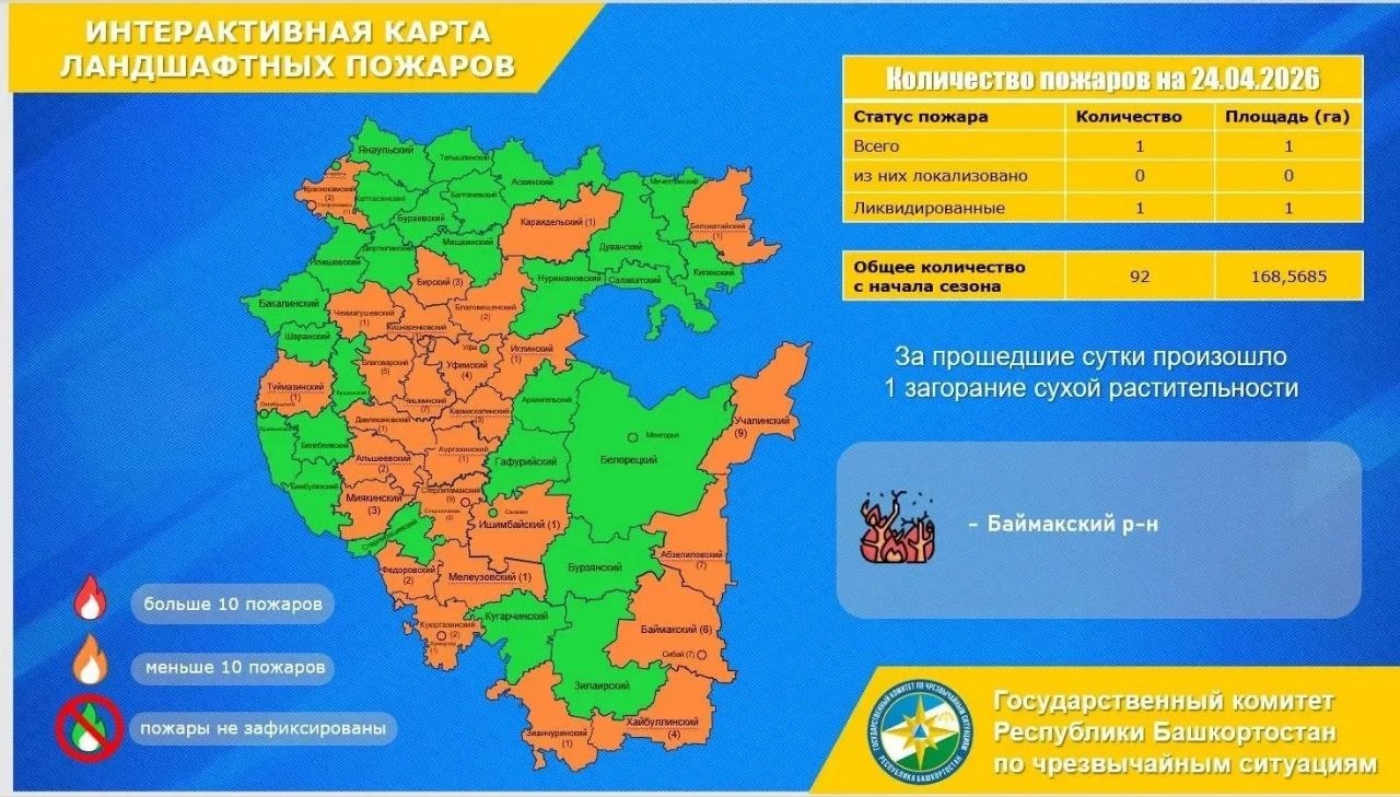 Также был выявлен один очаг горения сухой растительности. Пожар зафиксировали в Баймакском районе. Площадь горения составила 1 га.
