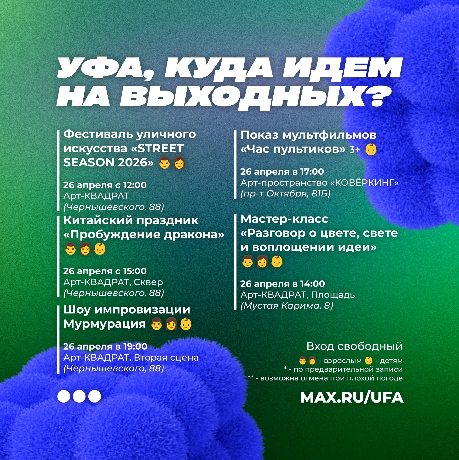 Если афиша стала для вас полезной - поставьте нам . Вам не сложно - а нам приятно и дальше собирать для вас бесплатные мероприятия на выходные