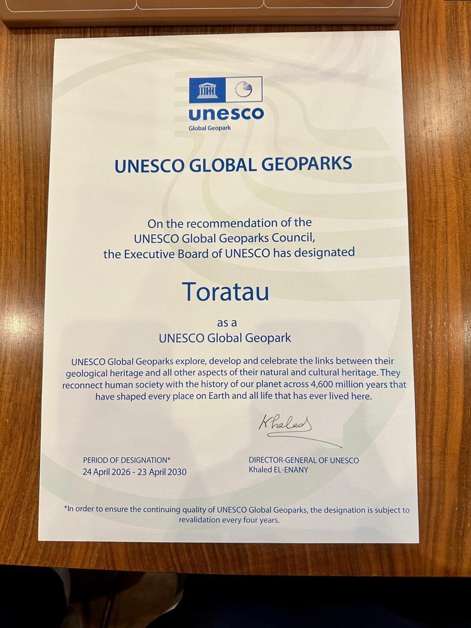 27 апреля в штаб-картире ЮНЕСКО состоялась церемония вручения сертификата о присвоении статуса «Глобального геопарка ЮНЕСКО» геологическому объекту "ТОРАТАУ", расположенному в Республике Башкортостан. Это второй российский геопарк, включенный в Сеть глобальных геопарков ЮНЕСКО.