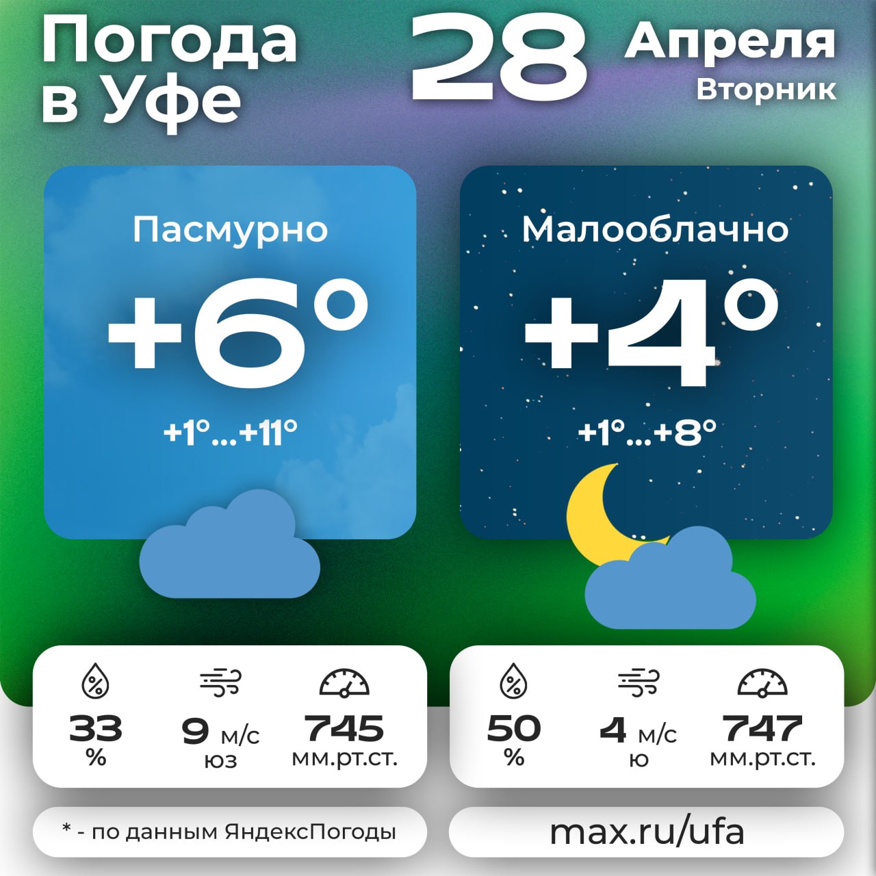Ночью небольшие дожди, местами до умеренных, по западу со снегом, днем местами небольшой дождь.Ветер юго-западный 9-14 м/с, местами порывы 15-20 м/с.Температура воздуха ночью 0,+5°, днем +7,+12°.На автодорогах видимость хорошая.В Уфе...